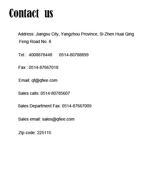 Jiangsu Qing Feng Engineering Group copyright????Company address: Jiangsu City, Yangzhou Province, Si Zhen Huai Qing Feng Road No. 8????Zip code: 225115????
